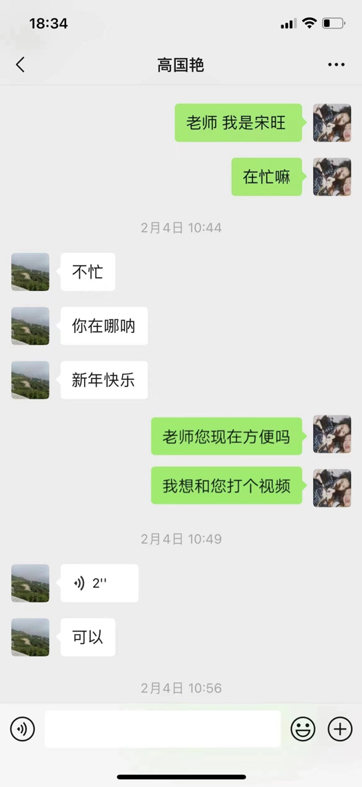 通过线上回访,与母校老师进行了感情的联络,老师讲述了学校的变化,学校的操场已经焕然一新,学校的教学设备更加先进,学弟学妹们学习条件更加好了。宋旺也向老师讲述了现在的大学生活,大学生活非常丰富。同时宋旺也通过老师向学弟学妹们表达了想法,作为学姐希望学弟学妹们更加努力的学习,将来为祖国和人民更好地服务。