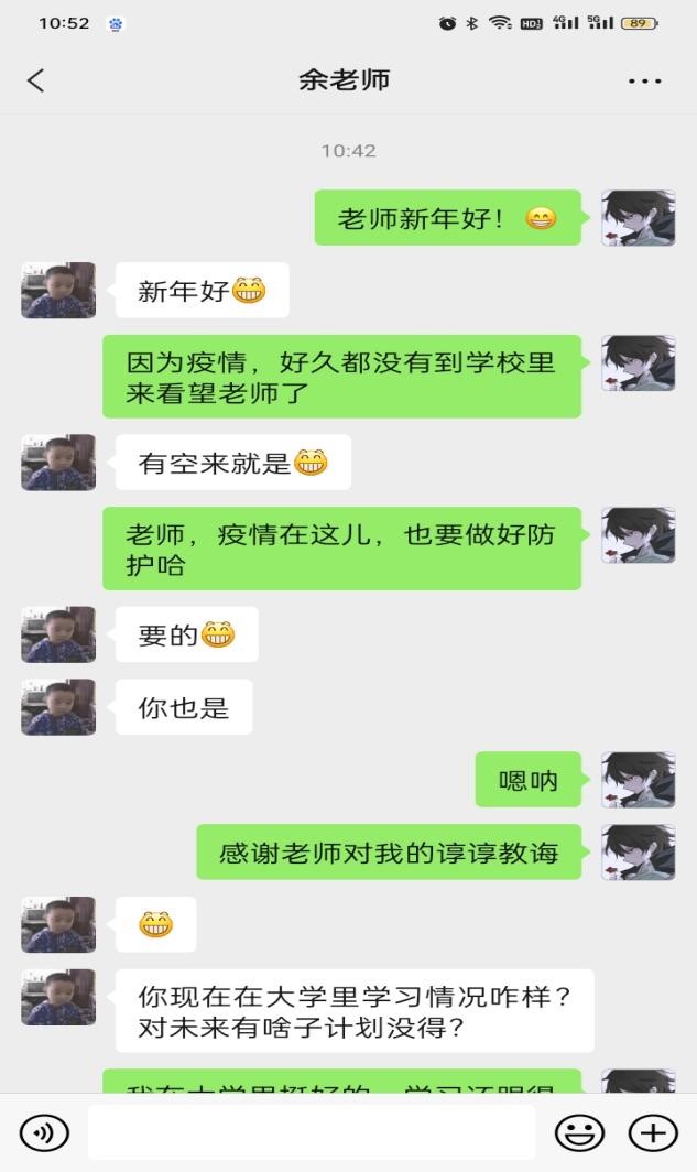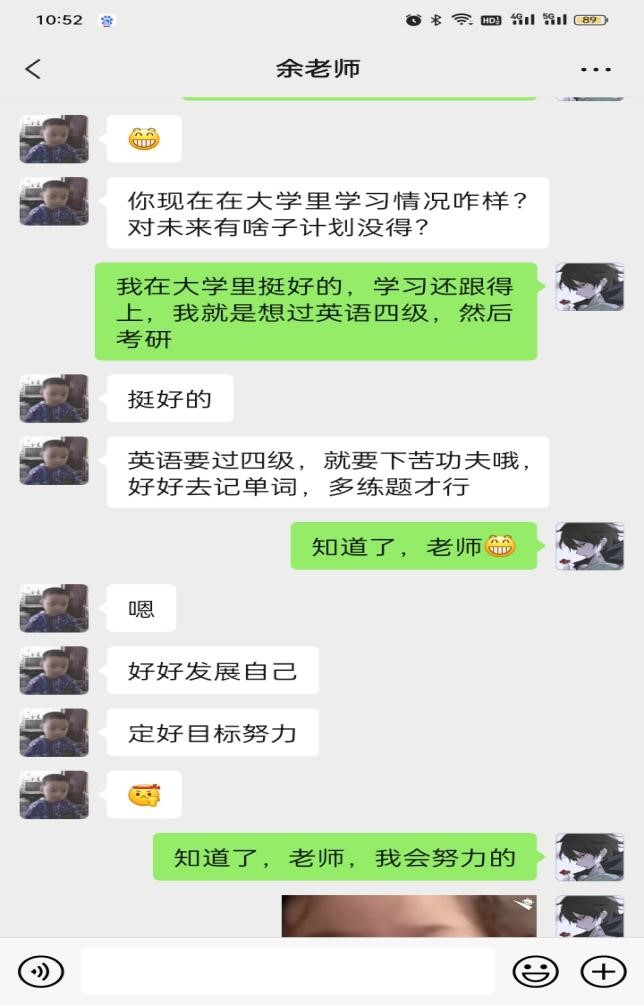 由于学校的一些规定和自身原因,本次母校回访采取线上视频的方式。2月5日晚上,我跟我高中时期的班主任老师陈老师进行了视频。在这次视频中我和陈老师进行了很好的交流,我向老师表达我对她的感激之情。交流过程中我向陈老师讲述了我近期的大学学习和生活以及一些自我规划。陈老师很关心我的大学学习并强调在大学也要好好学习,学到真本领,珍惜时间,对我的一些规划也提出了一些的建议,同时陈老师也叮嘱我在大学要注重自身的全面发展。通过这次的视频通话,我收获很多,使我坚定了努力学习的决心,不辜负老师的期待,不忘却老师的谆谆教诲。同时祝愿老师身体健康,万事如意,祝愿母校发展得越来越好。