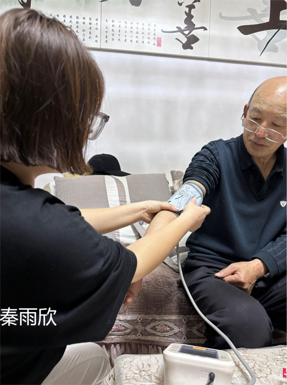 秦雨欣同学利用自己的理论知识与实践操作来服务他人,深感自豪。在第四学期,利用课余时间为家里的老人进行血压的测量,定期检测血压没有坏处,为家人奉献也会收获很多,去到老人多一点的地方来为更多的老人测量血压,好让他们知道自己的身体情况,有一个健康的身体。