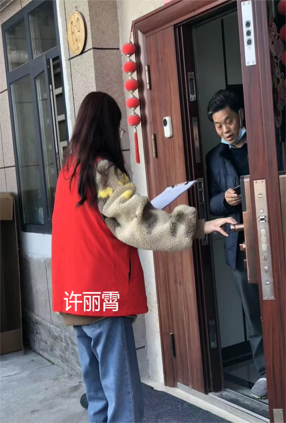 许丽霄同学在第四学期志愿服务中选择走进社区服务群众,在凤凰街道领海国际社区,与党群服务中心人员一起走访住户,调查老人健康情况,传播基础护理知识、急救知识,并且将社区老人编辑在册,对他们进行定期访查,促进社区老年健康发展。