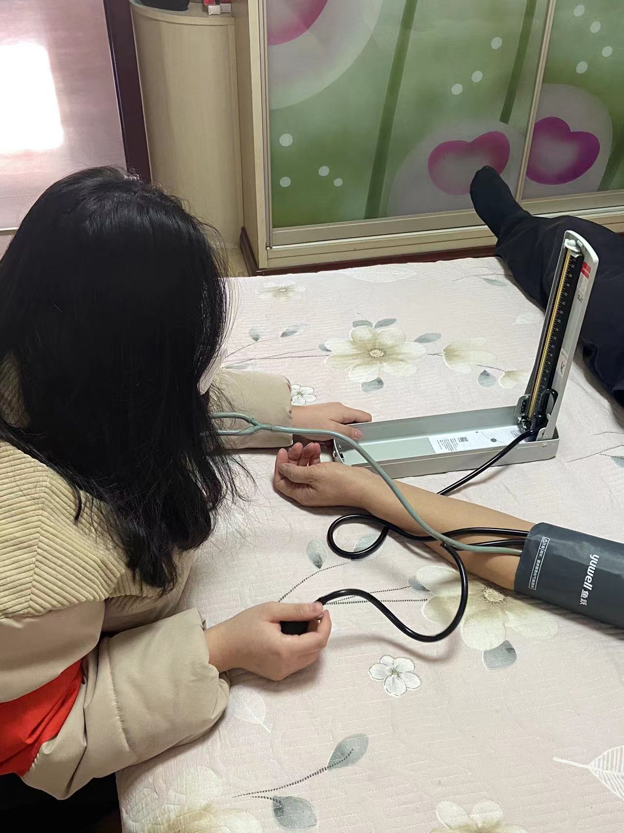 在志愿服务进行中,我们通过和当地社区居委会的沟通,为当地社区60岁以上的老年人进行健康评估和健康指导,健康评估中,我们为老年人进行测量血压、血糖,观察居民的身体状况,根据其身体条件进行健康指导,例如健康饮食、健康运动、如何正确服用药物等。