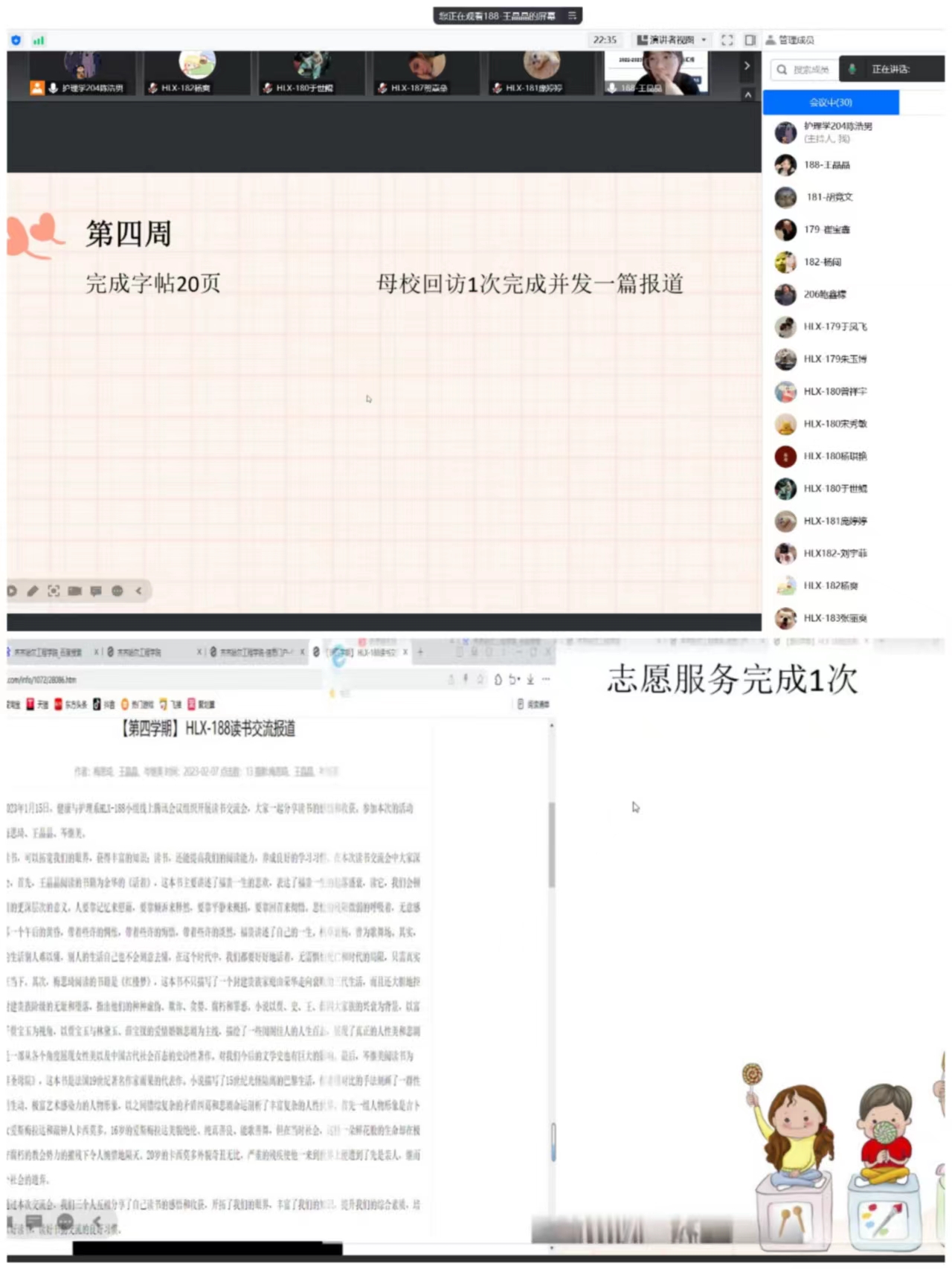 在第四周的项目实施过程中,各组同学都按要求有序的进行着。例如:在字帖临摹方面,同学们都写的非常整洁规范,可以看出是十分用心的。这充分体现了坚持不懈的精神。在读书交流方面,各小组分享了自己的阅读感受,汇报了读书的进程。读书可以增长人们的见识,开阔我们的视野,因此我们要多多读书,用知识来武装我们的头脑。在母校回访方面,有一半的小组都已经完成了并且分享了回访感受。在志愿服务方面,同学们结合专业特色服务社会。并且服务种类多样,比如与老人谈心、为老人测量血压、拔罐、清扫院外积雪等。在专业实践方面,同学们都有在认真的完成。除此之外,选修项目中各小组选择不同,分别有学习强国、健康运动、居家劳动、音乐鉴赏。以上项目同学们也都完成的非常认真。在会议最后老师也对会议进行了指导和总结。