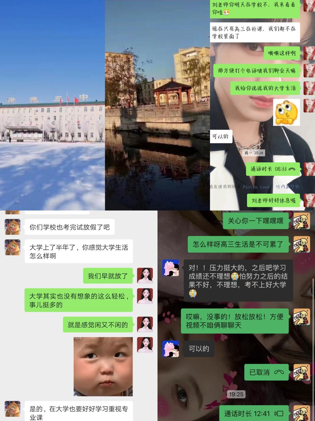 由于疫情原因,三位成员均采用线上的方式进行本次“母校回访”的活动。周希同学在与老师沟通交流中说到记忆最深的事情便是老师让同学写周记,老师也会认真阅读学生的周记并写上自己的评语。周希同学还与老师分享了进入大学后发生的趣事,老师也说到大学与高中并不相同,要学会独立自主,学会团队合作。张贺佳同学回到了母校,但是因为学校已经放假,无法进入,所以就远远地拍了一张照片,母校的变化,让她深深陷入过往的记忆之中。同时张贺佳同学也通过线上的方式跟正在高三的学妹分享了一些高三冲刺经验,鼓励高三的学妹,相信她一定可以取得一个好的成绩。因为疫情原因秦勉同学也只能独自走在空无一人的中学中回忆着过去的时光,并与老师在微信上进行了联系,慰问了老师的身体状况。老师也给了很多建议,并且祝福秦勉同学在今后的学习生活中能够顺利。