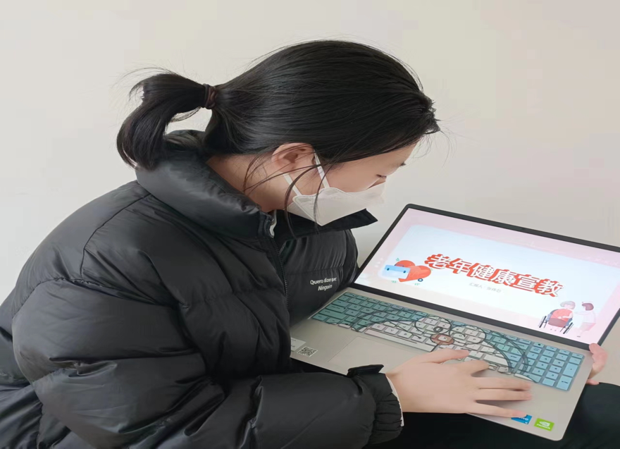 在健康宣教过程中,张伟芯同学体会到工作的成效取决于个人的进取性。进取地投入、热情地参与、耐心地引导、不厌其烦地解释说明,即使棘手的问题都能够迎刃而解。我们互学习,互努力,共付出,共奉献,原本没有的经验,也装的满满的。