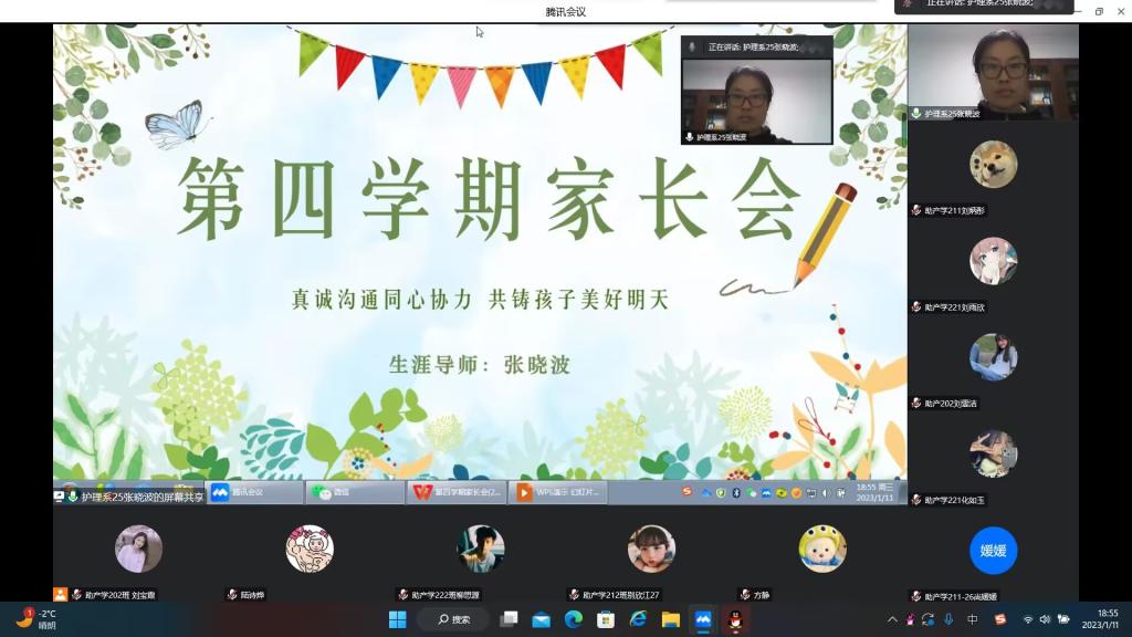 为了增进家长对学校工作的了解,加强老师与家长的沟通,同时更全面地了解自己孩子在校的学习情况,我系生涯导师张晓波老师于2023年1月11日,通过腾讯会议组织护理学和助产学专业的生涯学生家长开展第四学期家长会。