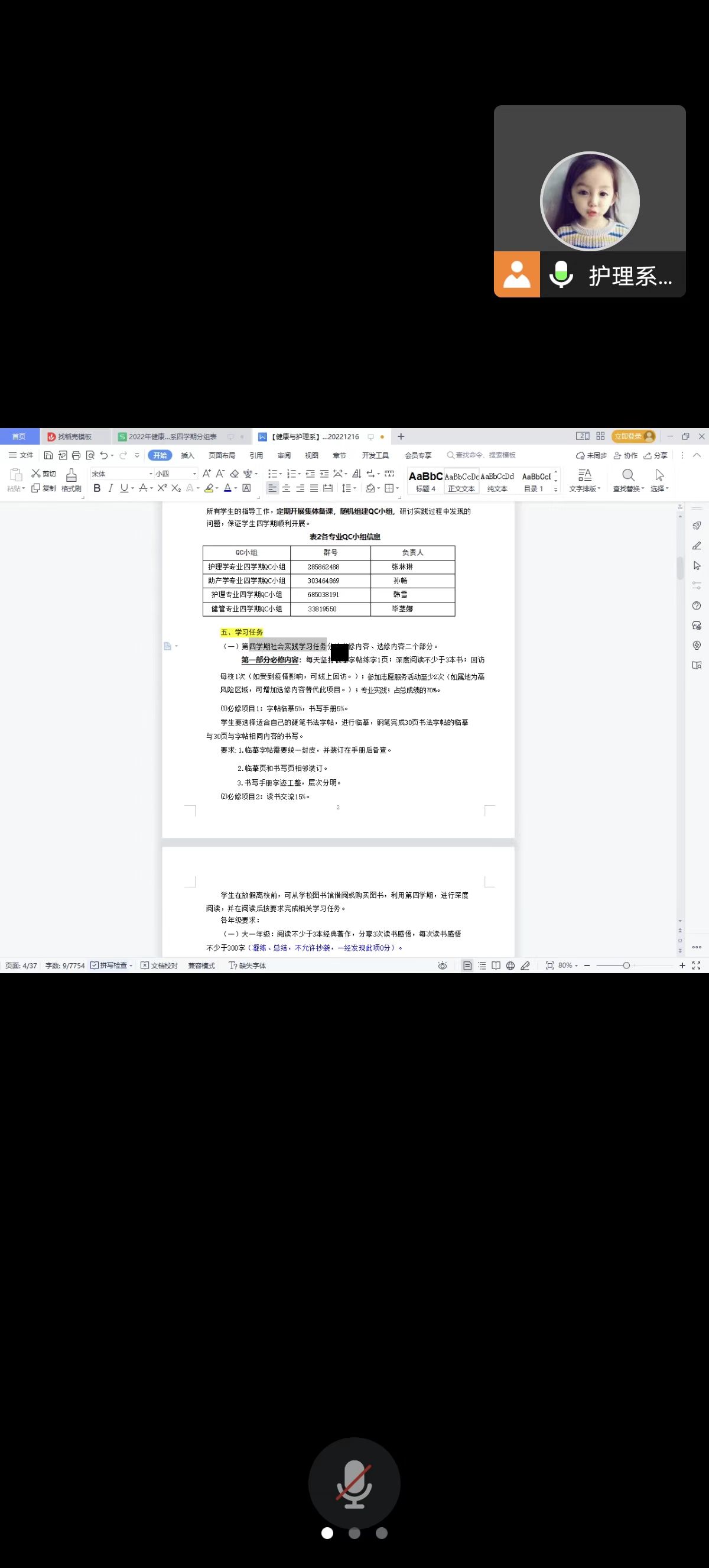 1月4日下午,生涯指导老师杨兰于腾讯会议组织开展第四学期动员会,HLX-093小组全体成员参加。会上杨兰老师说明了分组情况和第四学期各项内容并强调第四学期手册要字迹工整,照片清晰明了,对各个项目要有阶段性计划,明确第四学期的要求,清楚应当做什么、应当怎样做,珍惜第四学期实践机会。会议结束后,小组成员对第四学期规划进行了探讨,最后得出了本组的规划。