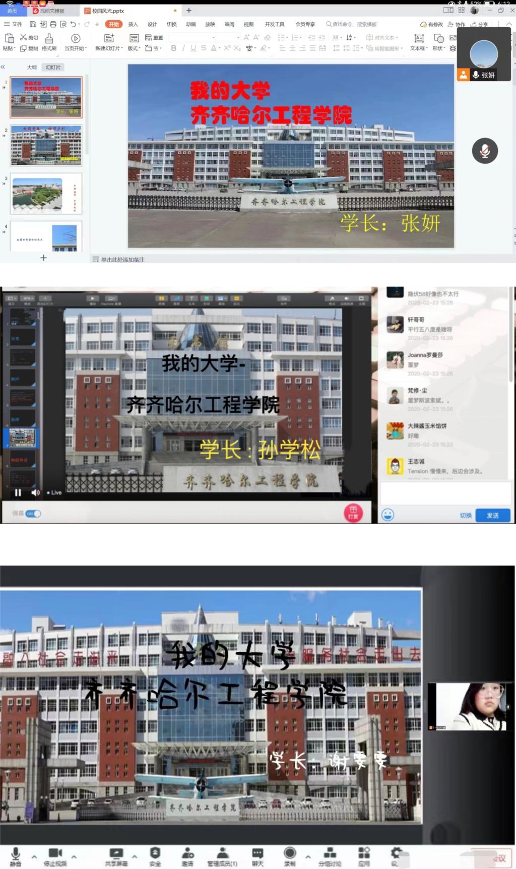 时光,依旧似流水,留下简单的身影。流浪于季节的轮回记忆中最普通的校服承载着最美好的记忆,刻录记忆的光碟,传唱母校的乐章。线上回访母校的形式打破了以往进班宣讲的常规,给人耳目一新的感觉。学姐们的认真准备,让母校学子们感受到了克服远距离的热情。学姐学长鞭辟入里的宣讲,帮助学子们对未来和人生确立了一个更为明晰的方向,那便是,不负青春,不负韶华,向着更高处奔赴!孙学松学长为大家详细介绍了齐工程的图书馆,希望大家在大学中好好努力,朝着自己人生目标奋勇前进!,谢雯雯学姐为自己的学弟学妹们介绍了齐工程的易湖及其周围的主要教学楼,这里绿树成荫,百草丰茂,景色秀丽,期待大家的到来!张妍学姐为学弟学妹们介绍了齐工程的特色护理院,这里有先进的技术设备,专业的为健康与护理系的每位学子在实践方面提供帮助。