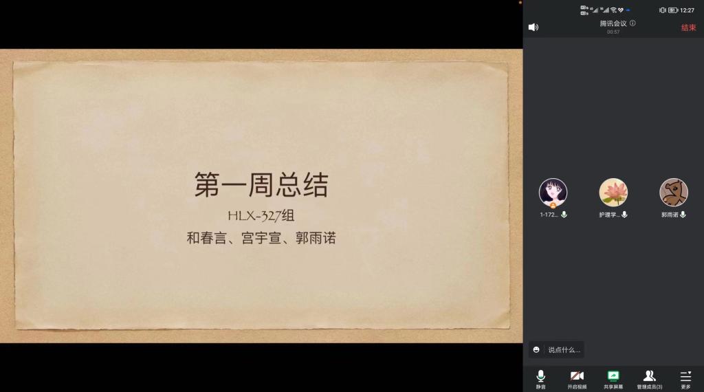 2023年1月9日上午,HLX-327组在腾讯会议中召开了第一周总结,总结第四学期第一周完成任务,会议由护理学(专升本三年制)221和春言主持,共三人参加。