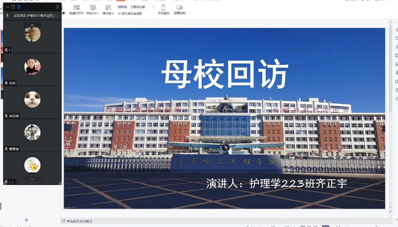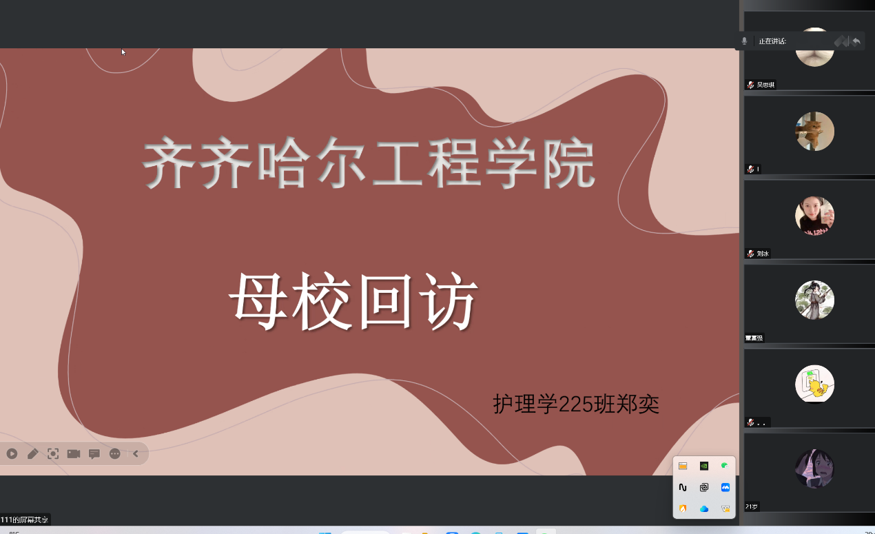 护理学225班郑奕同学去到她的母校——黑龙江应用职业学院,但是由于疫情原因并没有见到学弟学妹们,她委托曾经的老师召开的线上会议通过PPT汇报,向学弟学妹们分享了学习经验,与学弟学妹们进行了深刻交流,并表示期待与学弟学妹们在齐齐哈尔工程学院见面。