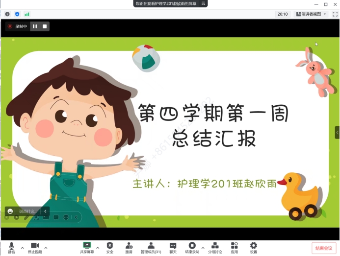 随着时间的流逝,第四学期已经度过了一周的时间,在2023年1月7日晚7点,尹娜老师通过腾讯会议召开了第一周的总结会议,由护理学201班赵欣雨同学主持,全体生涯学生参加。