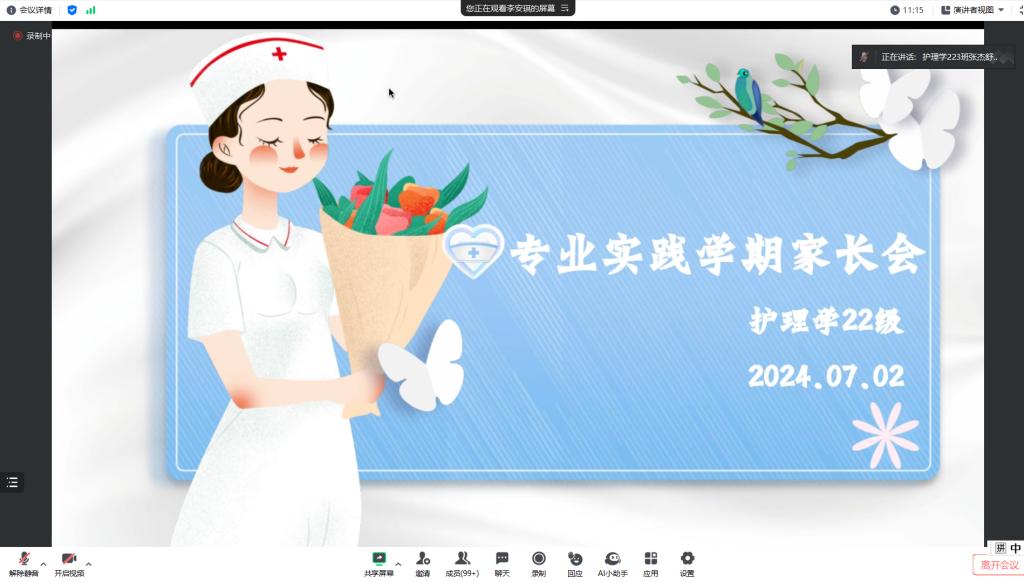 为加强家校之间的紧密联系,共同为学生保驾护航,确保专业实践学期顺利进行。7月3日19:30,护理学专业2022级在腾讯会议组织召开专业实践学期家长会。会议由辅导员老师李安琪主持,护理学专业负责人孙晓雪及护理学22级全体学生家长参加。