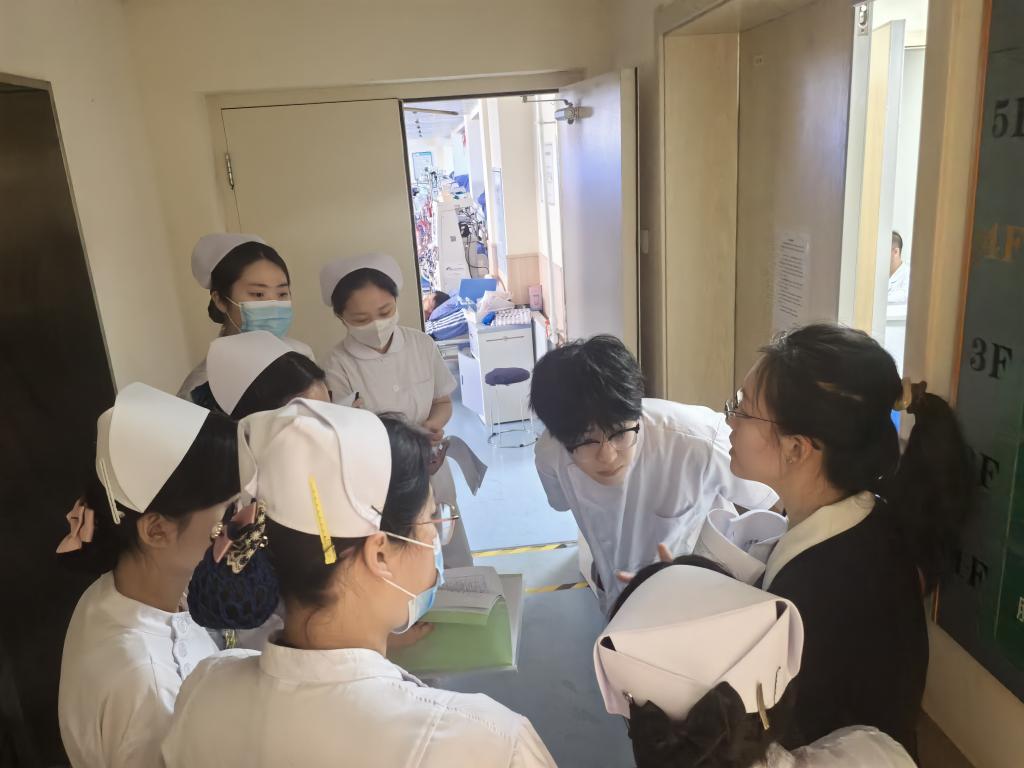 在仲泰医院,尹娜老师检查了学生学习手册的完成情况,并提出指导意见。嘱咐同学们要按要求完成相关内容,并及时上传学习通。在检查的过程与科室带教老师进行沟通,内科病房的老年患者居多,静脉输液难度较大,但同学们都能认真与带教老师进行学习并逐步掌握相关技巧。