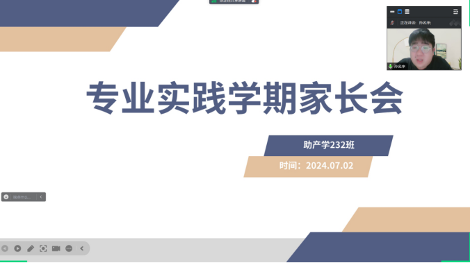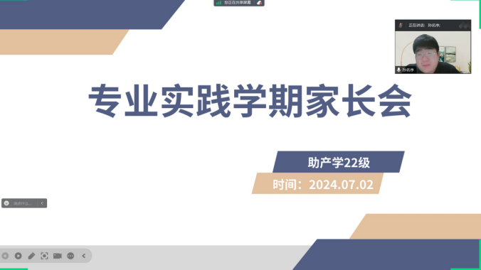 2024年7月2日20:00,助产学专业在线上召开专业实践学期家长会。会议由辅导员孙名序老师主持,助产学22级、232班全体家长参加。此次会议旨在给各位家长讲解同学们在专业实践学期内的见习内容以及同学们的成绩问题,共同推进专业实践学期的教学工作,提高学生的专业素养和实践能力。