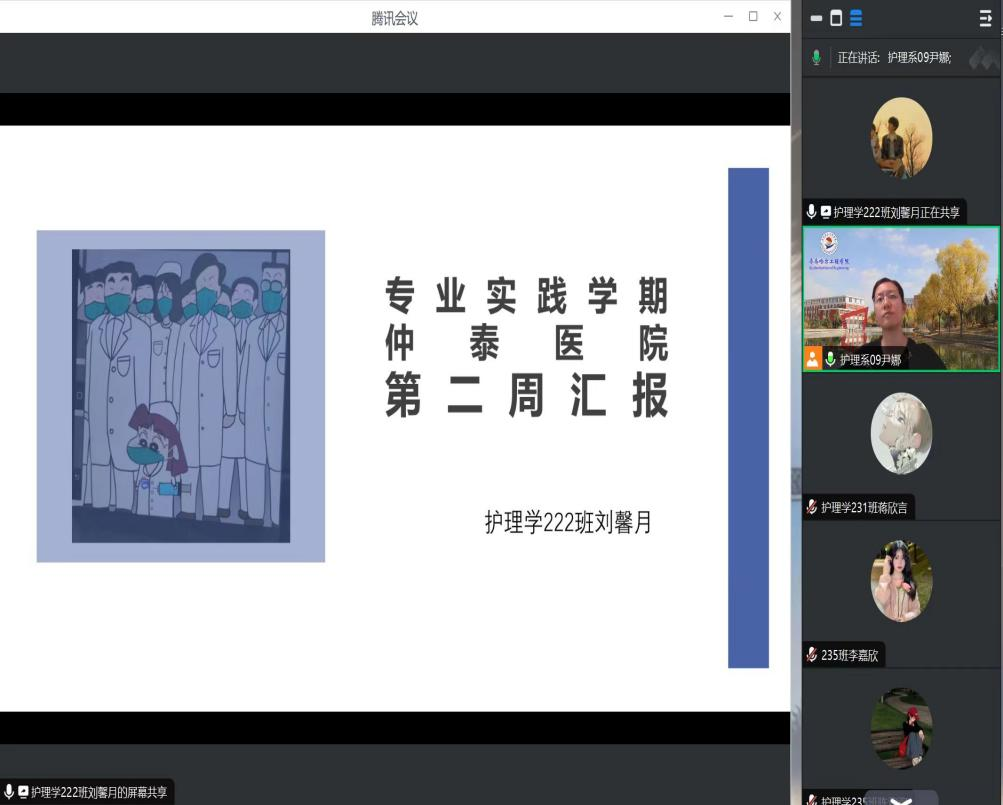 时光匆匆,转眼间我们的实习已经进入了第二周。2024年6月28日晚8点半,尹娜老师利用腾讯会议召开第二周总结会议。全体实习学生参加了本次会议,护理学222班刘馨月担任本次会议的主持人。