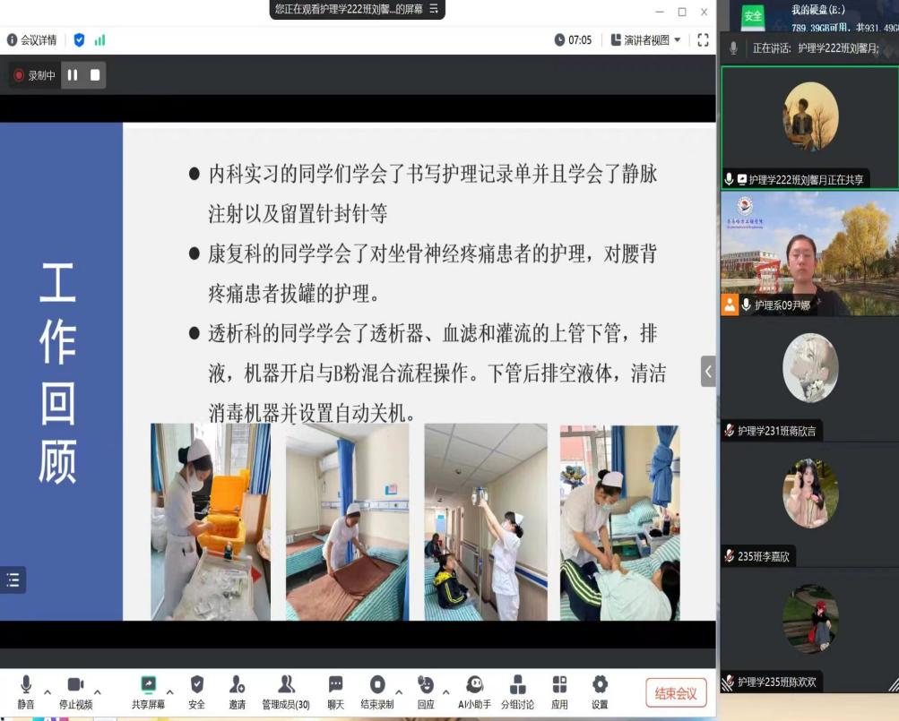 首先,刘馨月同学进行了实习工作回顾,在内科实习的同学们学会了书写护理记录单并且学会了静脉注射以及留置针封针等,康复科的同学学会了对坐骨神经疼痛患者的护理,对腰背疼痛患者拔罐的护理,透析科的同学学会了透析器、血滤和灌流的上管下管,排液,机器开启与B粉混合流程操作。下管后排空液体,清洁消毒机器并设置自动关机。