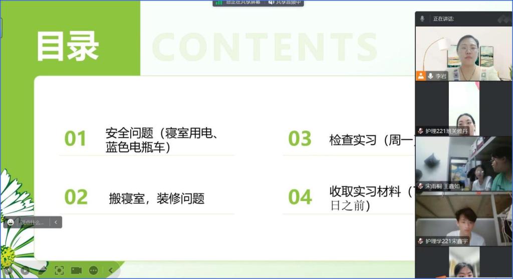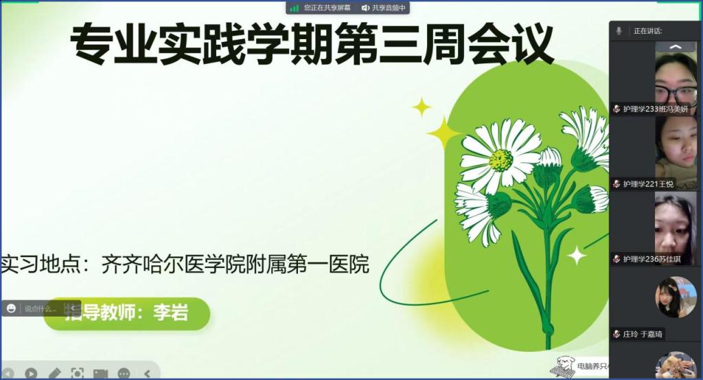 2024年7月5日,开展了专业实践学期第三周线上会议,李岩老师强调了实习期间安全问题,寝室用电问题和不可以用违规电器,在上班期间不可以骑共享电动车,避免发生危险。关于女生反应搬寝室和装修问题进行了处理。另外强调在下周一会进行检查实习,要求着装整齐,工作态度认真。李岩老师提醒同学们除了要知道自己应该完成哪些任务,要做到天天有作业,周周有反思的基础上还有科普宣教视频、调研报告、个案报告、老年疾病护理案例作业要按时完成。第三组同学对于本周实习进行了汇报总结,第三组同学在汇报中表述从刚进入医院时的不了解不熟悉到现在已经进行了三周的实习慢慢适应和熟悉工作流程,她们也深切地感受到了医疗工作的辛苦和责任。在实习中,深刻体会到了团队协作的重要性。小组四人,虽然在不同的科室实习,但都能够相互学习、相互帮助,共同面对困难。李岩老师对本次汇报进行了对每位同学的汇报进行了评价和总结。