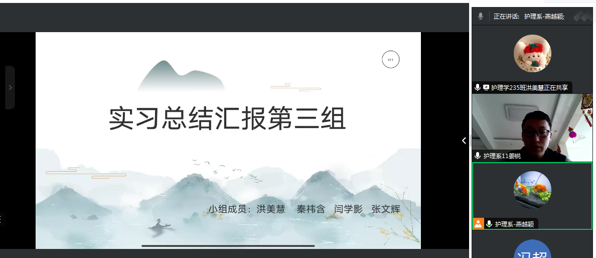 本次会议分为两个部分,第一部分是让三个组(3、4、5)进行第三周的实习总结。洪美慧、王子明、张佳慧三位同学都结合自己小组的实习情况分享了自己小组的收获(如采血和拔针),并进行了他们的成果展示,以及对第三周实习过程中的不足进行了反思(如与患者沟通不顺利等)并完善。最后明确了自己小组每名组员的下一步学习计划,让自己始终保持积极的学习态度。