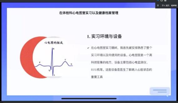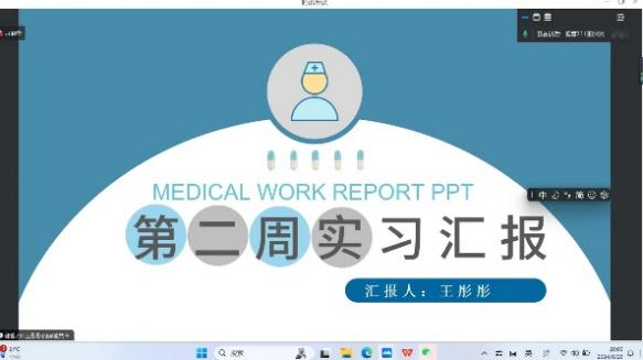 会议伊始,袁凤娟老师从三个医院的实习学生中分别随机抽取一位对自己在该医院实习第二周的工作进行了简要的回顾。首先,由在建华医院北院实习的王彤彤同学对自己在彩超科室实习一周后的成果及感悟进行了总结汇报。其次,由在中医院北院实习的吴金浩同学对自己在多普勒科室实习两周后的深入了解及学习进行了总结汇报。最后,由在中医院南院实习的杨姗姗同学对自己在心电图科室实习一周后的所见所闻所学进行了总结汇报。