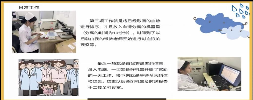 首先,田芯芯老师强调了要继续完成每日签到打卡的要求,按时完成每日心得的实习作业,另外实习手册要按部就班的书写、并再次强调了在实习岗位中的着装问题,更着重强调了护理学专业举办的“综合护理精英挑战赛”的竞赛规则和活动流程。其次是吴冰同学对本周东湖社区卫生服务中心的实习进行了阶段汇报,吴冰同学认为作为一名护士需要具备足够的耐心、细心和责任心。