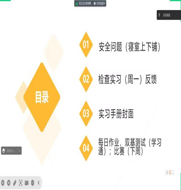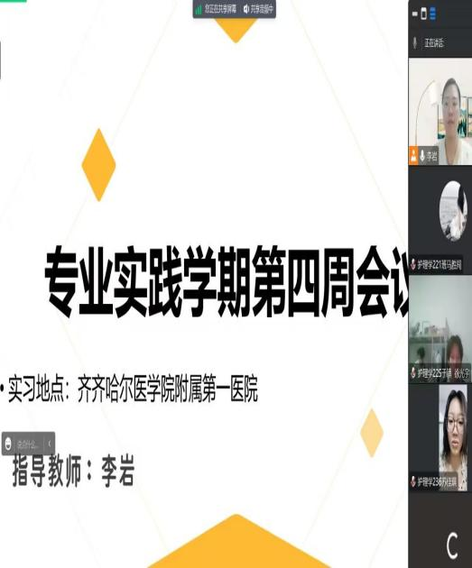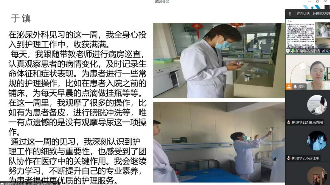 7月12日,李岩老师在腾讯会议中召开专业实践学期第四周会议,全体同学参加。首先,李岩老师就安全、检查实习情况进行了强调与反馈,她表示,在检查实习中,同学们能明确自己的任务,并且得到了科室带教老师的好评。其次,布置了下一周的学习任务。最后,本次会议第四组同学对实习进行了汇报与总结。朱家玺在骨科实习,冯美妍和王怡单在普外科实习,于镇在泌尿外科实习。四位同学各自了解了不同科室的工作流程,操作技术,在实习中,他们将学到的知识运用到了实践当中,也学到了理论中没有接触到的知识,增强了他们动手能力,让他们的专业技能得到了进一步的提升。她们表示,在今后的实习中,会更加努力的工作,为患者提供更好的服务。