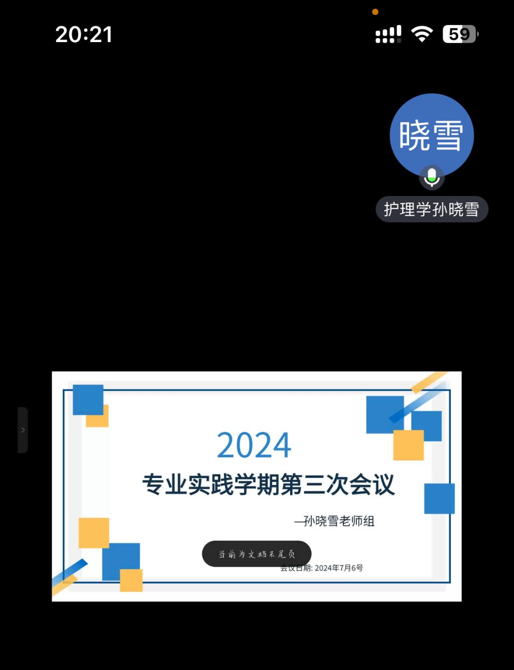 2024年7月6日,星期六,护理学专业实践学期溪畔社区卫生服务中心实习第三周情况总结会议顺利举行。本次会议旨在对过去一周的实习情况进行全面梳理和总结,为后续的实习工作提供指导和借鉴。会议伊始,护理学专业长孙晓雪老师对本周的整体