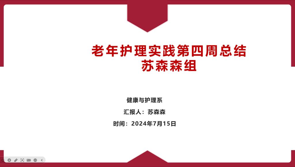 其次,苏森森老师对专业实践学期前三周的情况完成表的填写要求进行了强调,要求同学们在过年前把前三周未填写的内容进行完善,把所完成内容的佐证材料放置表格中,苏森森老师讲述专业实践学期特色活动时,苏森森老师对昨天已经结束的老年护理实践技能大赛初赛的选拔的完成情况进行了总结,接下来将开展的老年疾病防治科普视频希望同学认真对待,完成的同时也要保证质量。在实践过程中,同学们也讲述自己遇到的困难和挑战,例如部分老人听力或表达能力有限,沟通存在一定障碍,还有一些老人对新事物的接受度较低等。苏森森老师对同学们说,对老人需要更加耐心和细致地引导,始终保持着热情和爱心,让每一位老人都能感受到关怀和温暖。