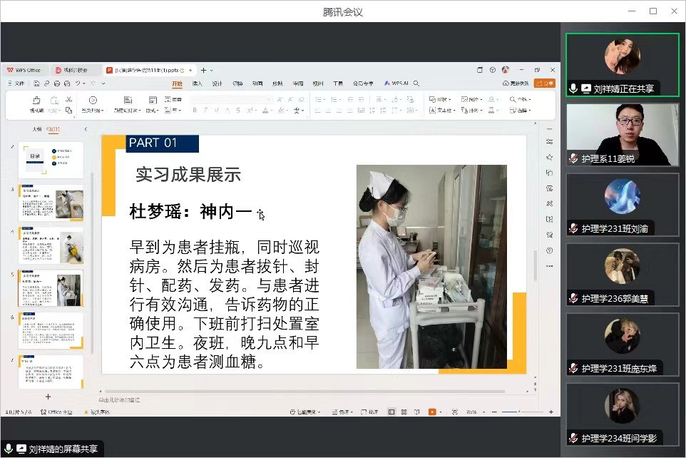 在2024年7月21日中午12点40分,康护工程系指导教师姜锐、燕越颖在腾讯会议召开了2024年护理学专业实践学期第五周总结会议,会议由姜锐以及燕越颖老师主持。护理学生涯学生53名同学参加。会议主要内容为专业实践学期实习安全内容的指导与同学们这一周的汇报工作