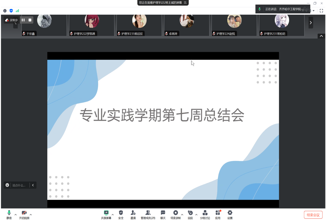 为加强学生的专业素养和自信心,通过实习经历的总结与反思,强化学生在护理相关方面的能力,于晶老师于8月1日腾讯会议召开第七周总结会议。