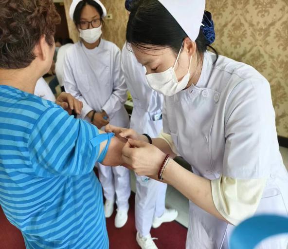 在抽血过程中遇到一位很紧张的爷爷,于是我们轻声安慰:“爷爷,您别紧张,就像被小蚊子叮了一下,很快就好,不要担心。”爷爷微微点头,虽然眼神中还会透露出一丝紧张,但在我们的贴心安抚下,顺利完成了抽血;对于一些行动不便的老人,我们会拿着用物来到他们的房间,在床边为他们进行抽血。在本次抽血过程中,不仅让老人们感受到了社会对他们的关爱和重视,也为养老院的健康管理工作提供了有力的支持。除此之外,我们在养老院进行着一些基本的操作和服务,也会协助护理人员为老人们测量血压、血糖,关注他们的健康状况。同时,我也积极参与到养老院的康复训练活动中,帮助老人们进行简单的肢体锻炼,增强他们的身体素质。