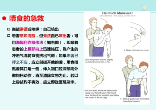 抢救措施:施救者站在患者背后,两臂环绕患者的腰部,一手握拳,将拳头的拇指一侧放在患者胸廓下和脐上的腹部。另一只手抓住拳头、快速向上重击压迫患者的腹部,重复多次,直到异物排出。