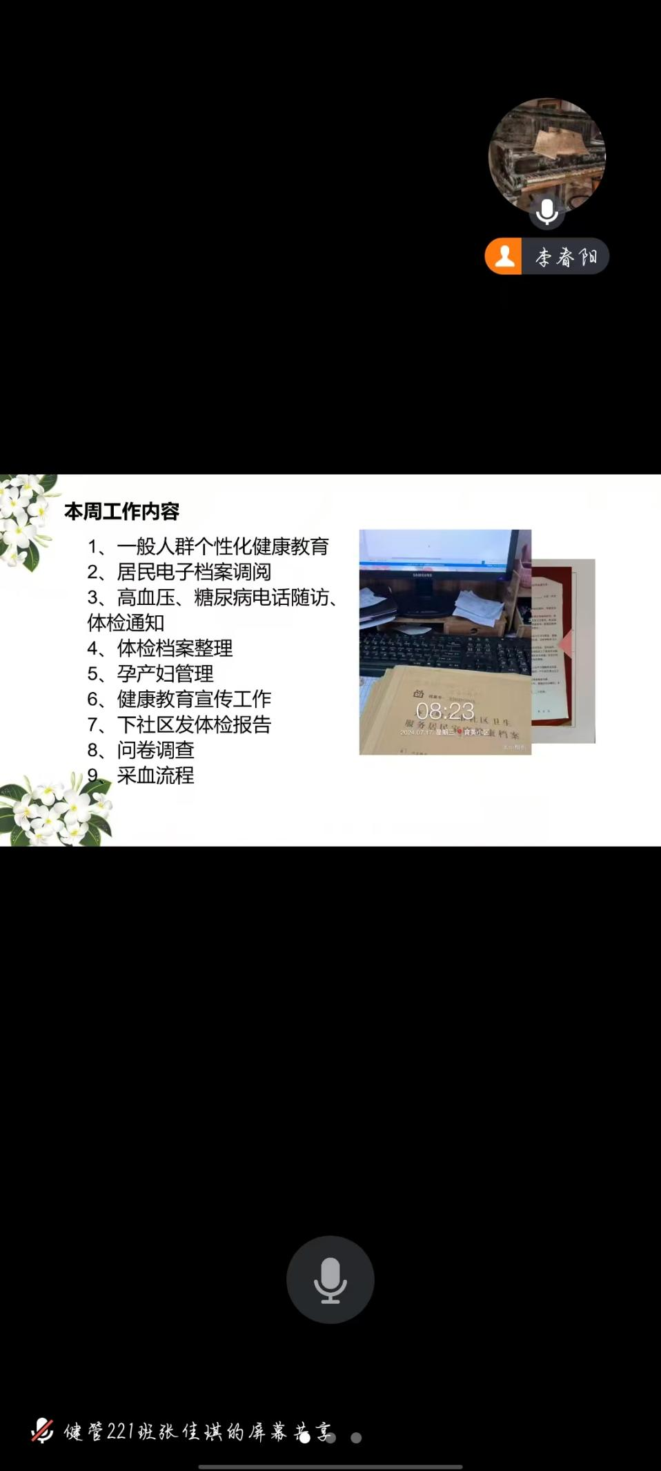 首先,刘瑞老师为我们讲解了进行专业实践时的注意事项以实习过程的须知包括:实习规范事宜,如请假流程、实习礼仪、安全问题等。随后建设社区由李春阳和西大桥社区毛新宇同学进行分享汇报,其中分享了建立和完善居民健康档案,对居民的基本信息、健康状况、家族病史等进行详细记录和整理等。随后,刘瑞老师总结以上汇报问题。最后,刘瑞老师告诫大家在实习中同学们要对别人的建议虚心听取,把握实习机会,主动向带教老师和同事请教问题,不断丰富自己的知识和技能。并努力学到把课本学到的知道应用到实际工作中,尽力做到理论和实际相结合的最佳状态。旨在让我们将所学的理论知识应用于实际工作中,熟悉社区卫生服务的流程和内容,提高实践能力和综合素质,为今后的职业发展打下坚实的基础。
