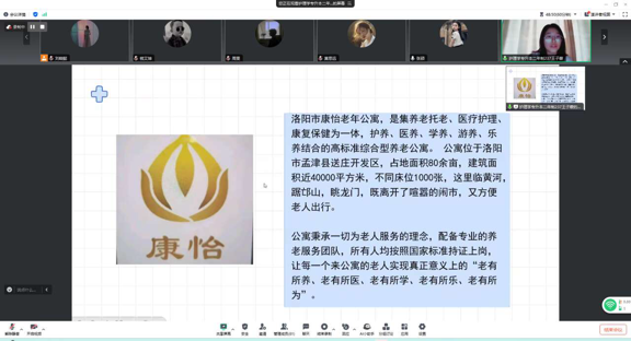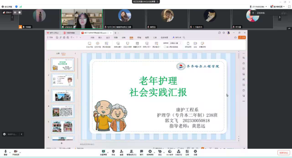 参与答辩的同学们依次通过屏幕分享自己的实践经历与成果。他们以精心准备的PPT和详细的讲解,呈现了在老年护理领域的深入探索。有的同学讲述了在养老院中为老人们制定个性化护理方案的过程,通过细致的观察和评估,满足了不同老人的特殊需求;有的同学则分享了与老人建立深厚情感联系的故事,展现出关爱与陪伴在老年护理中的重要性。