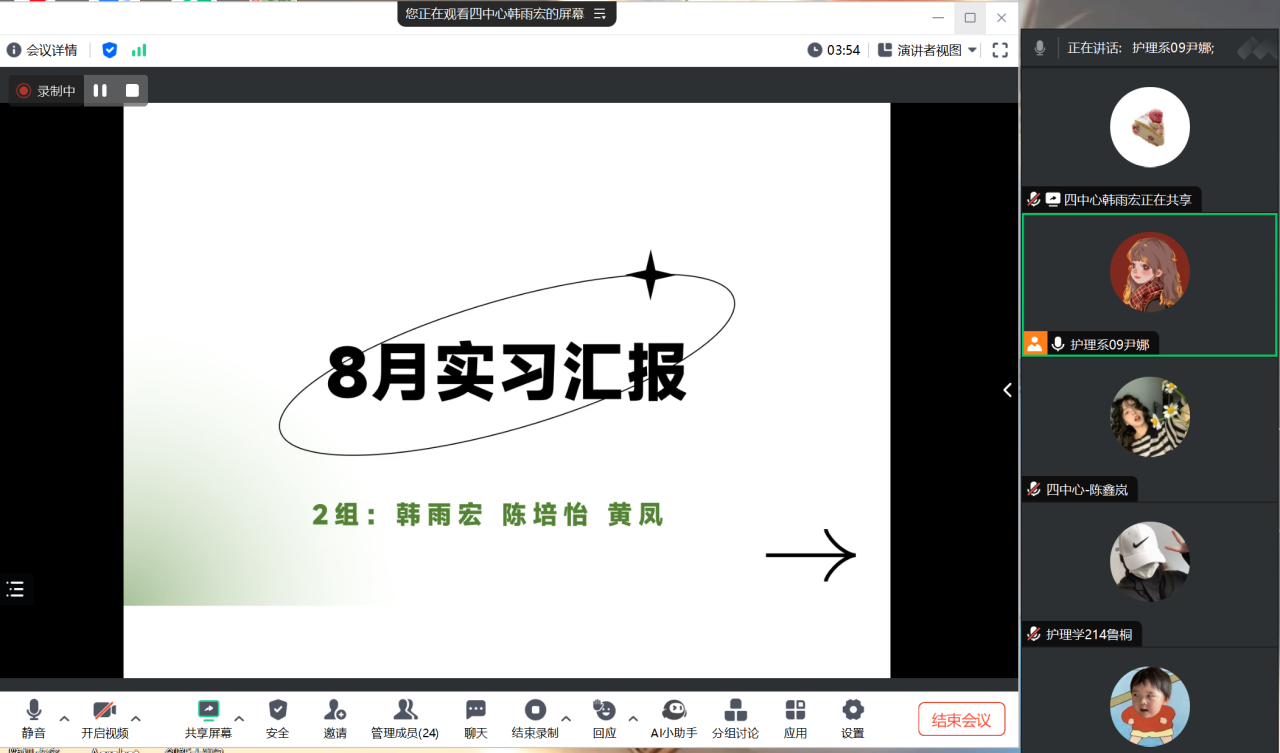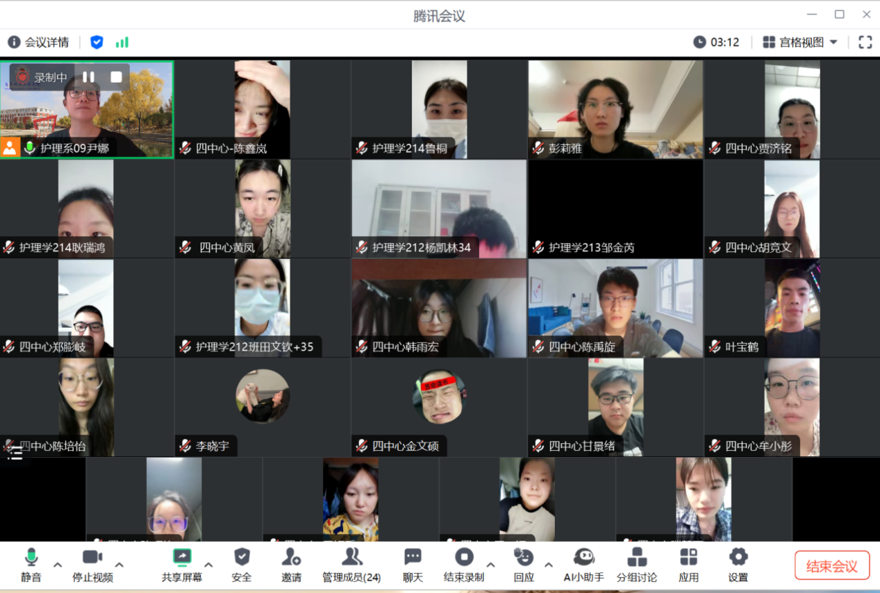 2024年8月26日晚,指导教师尹娜通过腾讯会议的方式召开天津第四中心医院毕业实习8月份的实习阶段总结会议,会议由韩雨宏同学主持,全体实习学生参加。
