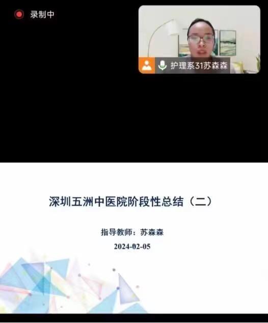 2024年2月5日晚20:00校外课堂指导教师苏森森通过腾讯会议线上形式为深圳五洲中医院开展阶段性总结,总结一个月整体情况,全体同学参加。