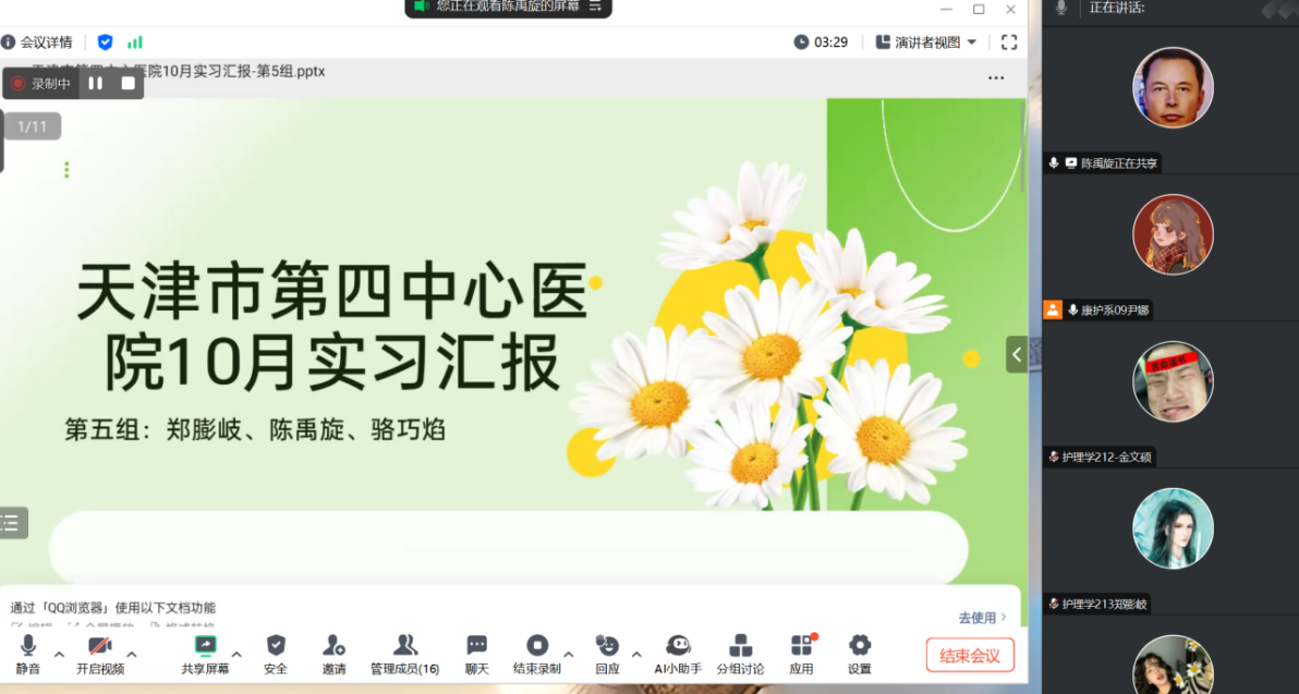 2024年10月13日晚,指导教师尹娜通过腾讯会议的方式召开天津第四中心医院毕业实习10月份的实习阶段总结会议,会议由陈禹旋同学主持,全体实习学生参加。