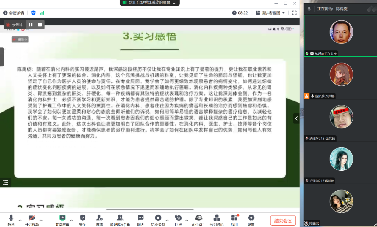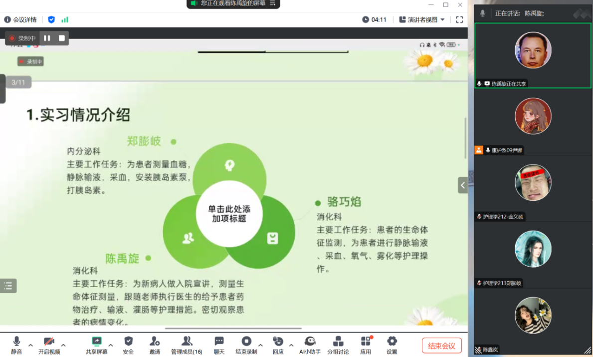 会议初始,陈禹旋同学首先介绍了十月份全体学生实习科室情况,同学们按组分别去了肾内科、内分泌科、消化内科进行实习,随后,简单介绍内分泌科的日常工作流程,包括到岗后、转房、新病人的接待等内容。会议中,郑鹏岐同学分享了自己在内分泌科所学到的知识,在内分泌科的实习过程中,他掌握了如何监测患者的血糖水平以及调整胰岛素剂量的方法。骆巧焰同学也分享了自己的心得,实习期间深刻体验到了书本知识与实际操作相结合的重要性。在实习过程中,面对不同的患者,往往需要有足够多的耐心,多倾听患者的诉求,学会沟通是我们实习过程中最重要的一堂课。