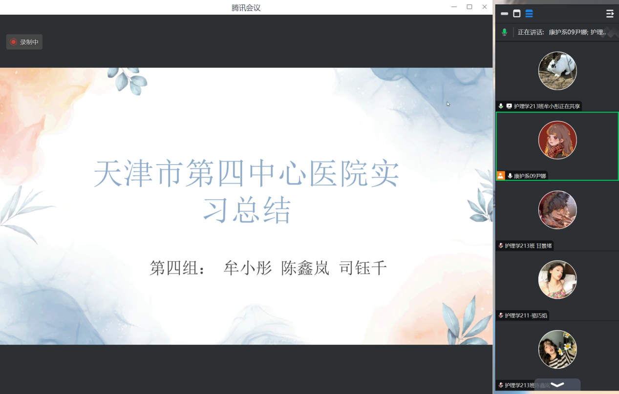 2024年10月19日晚,指导教师尹娜通过腾讯会议的方式召开天津市第四中心医院毕业实习10月份第3周实习阶段总结会议,会议由牟小彤同学主持,全体实习学生参加。