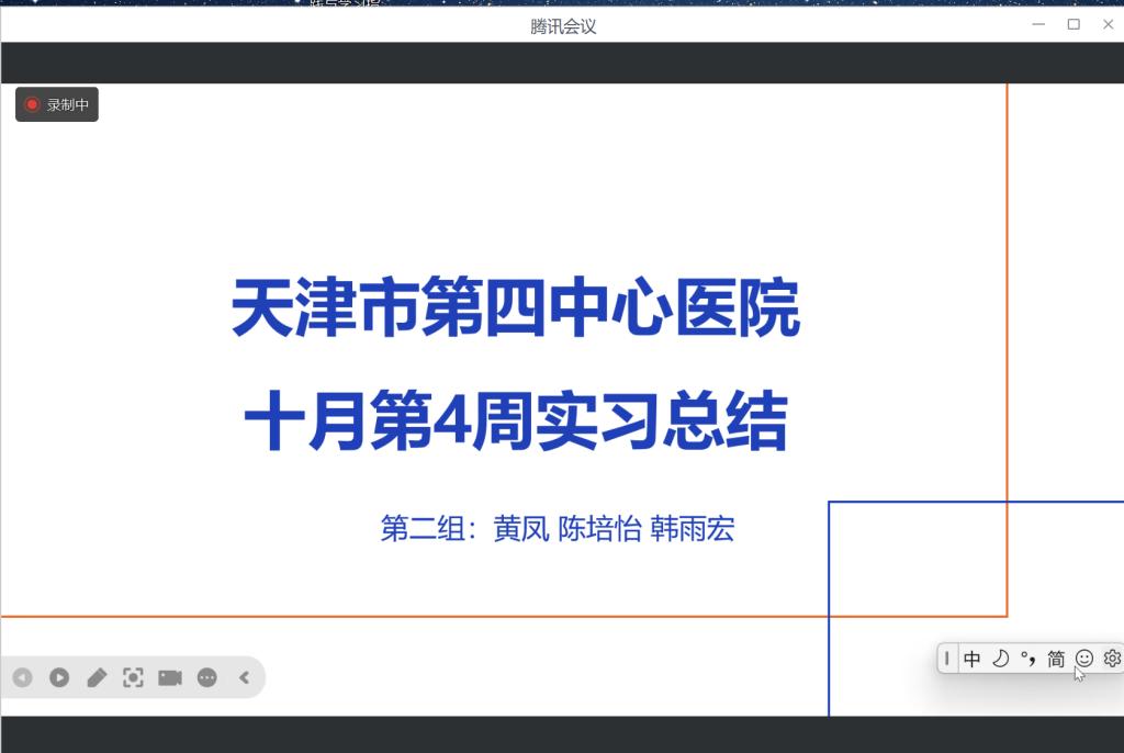 2024年10月27日晚,指导教师尹娜通过腾讯会议的方式召开天津市第四中心医院毕业实习10月份第4周实习阶段总结会议,会议由陈培怡同学主持,全体实习学生参加。