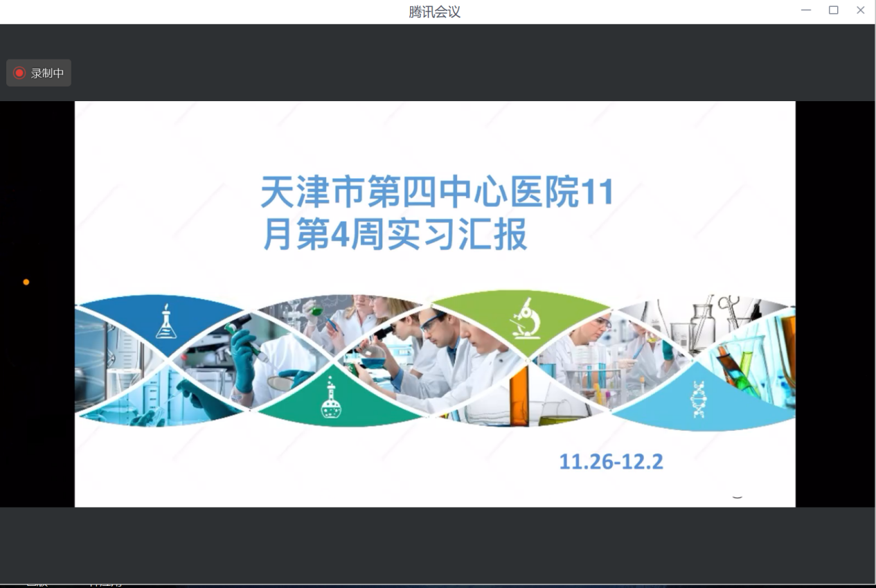 2024年12月4日晚,指导教师尹娜通过腾讯会议的方式召开天津第四中心医院毕业实习12月份的实习阶段总结会议,会议由骆巧焰同学主持,全体实习学生参加。