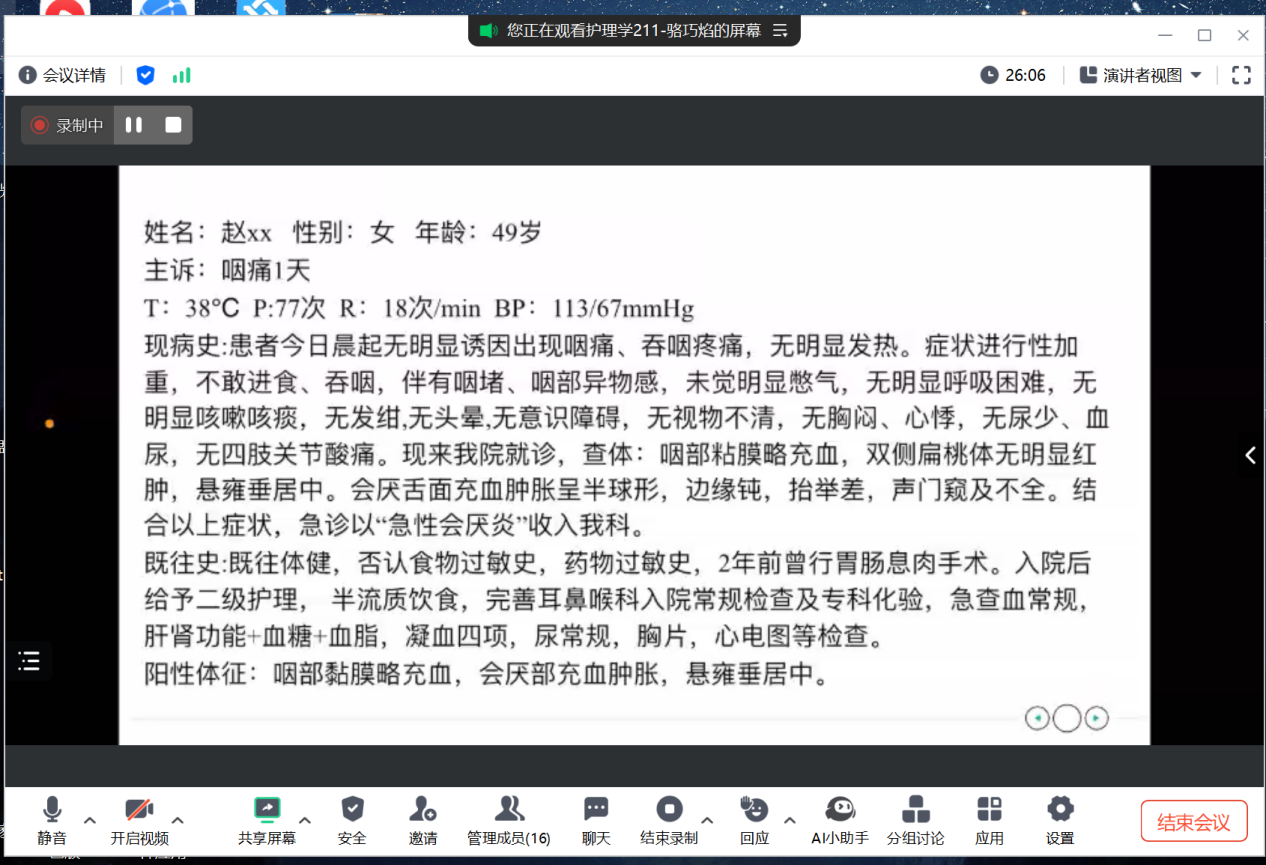 接下来实习汇报,骆巧焰同学首先介绍了十二月份全体学生实习科室情况,同学们按组分别去了胸外科、泌尿科、耳鼻喉外科、进行实习,随后,简单介绍泌尿科的日常工作流程,包括到岗后、转房、新病人的接待等内容。会议中,郑鹏岐同学分享了自己在泌尿科所学到的知识,在泌尿的实习过程中,他掌握了如何导尿以及会阴护理的方法。陈禹旋同学也分享了自己的心得,实习期间深刻体验到了书本知识与实际操作相结合的重要性。在实习过程中,面对不同的患者,往往需要有足够多的耐心,多倾听患者的诉求,学会沟通是我们实习过程中最重要的一堂课。