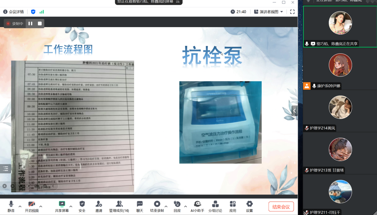 接下来实习汇报,陈鑫岚同学首先介绍了十二月份全体学生实习科室情况,同学们按组分别去了肿瘤科,icu进行实习,随后,简单介绍肿瘤科的日常工作流程,包括皮下,肌内注射,抗栓泵的使用等内容。会议中司钰千分享了自己的心得,讲述了实习期间深刻体验到了书本知识与实际操作相结合的重要性,要多看多学多问。在实习过程中,面对不同的患者,往往需要有足够多的耐心,多倾听患者的诉求。面对不同的疾病,采取针对性治疗。尹娜老师对于真实案例提出了以下建议:对于病人采取个性化护理。如果出现并发症,要描述并发症的预防与护理,全面描写而不能只写并发症。化疗是此病人的主要治疗方式,要突出化疗术后的病情发展变化,并针对化疗术后的辅助检查提出针对性护理措施。药物护理是个案报告的书写重点。