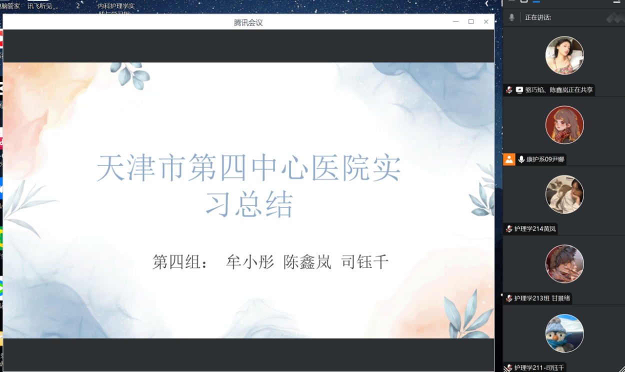 2024年12月21日晚,指导教师尹娜通过腾讯会议的方式召开天津第四中心医院毕业实习12月份的实习阶段总结会议,会议由陈鑫岚同学主持,全体实习学生参加。