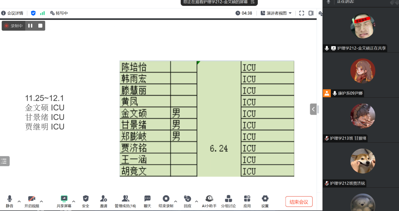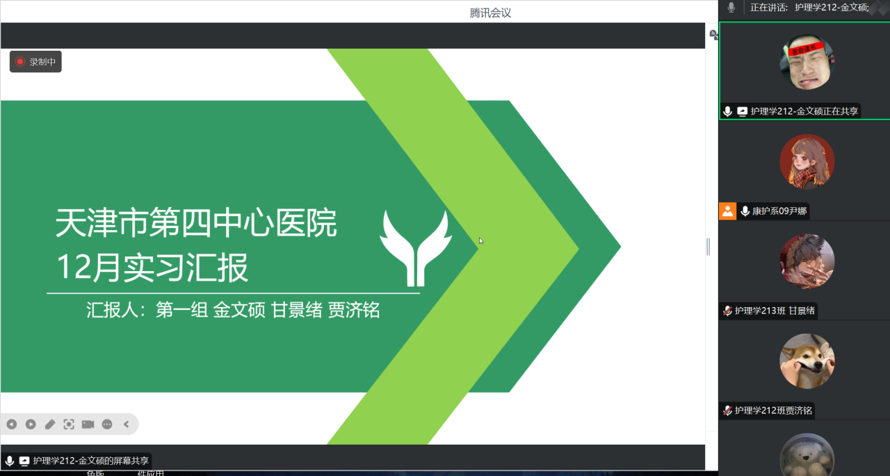 2024年12月27日晚,尹娜老师通过腾讯会议的方式召开天津第四中心医院毕业实习12月份第4周的实习阶段总结会议,会议由金文硕同学主持,全体实习学生参加。