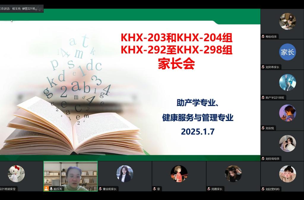 2025年1月7日下午,生涯指导教师相玉秀老师组织健管专业社会实践学期KHX-203至KHX-204组和助产学专业社会实践学期KHX-292至KHX-298组共9组36名学生的家长进行2024-2025学年社会实践学期家长会。