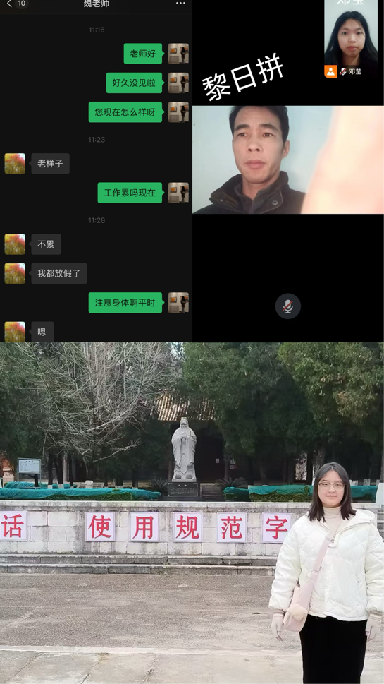 在学校老师的陪同下,宋怡首先参观了校园,熟悉的教学楼、操场、图书馆勾起了他们无数美好的回忆。曾经奋斗过的教室、挥洒汗水的操场,一切都似曾相识,却又在岁月的洗礼中焕发出新的生机。杨子怡、邓莹通过线上回访方式,对老师进行问候,老师也对我们现存的生活及学习问题进行指导和解惑。