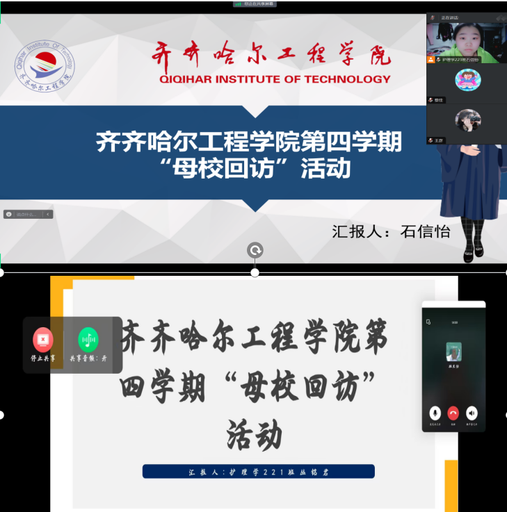 回访伊始,石信怡同学向学弟学妹们讲述着二年半的大学生活,在回访过程中,石信怡鼓励学弟学妹们积极提出问题,希望同学们能克服紧张的心理情绪,找到正确适合自己的学习方式,积极向老师提出问题,并解决问题。就是因为母校的联系才有了现在的我们和同学们分享的机会。很开心能与学弟学妹们进行交流,很荣幸。王娟同学于2025年1月10日与高中班主任取得联系,与班主任了解现在学校的情况与学生的各种情况与问题,和班主任说了自己在大学的各种经历,学到的知识和技能。她和班主任说明白了大学需要自律,并不像高中一样,大学的生活丰富,交到了许多朋友。她很开心能与高中班主任谈心,很荣幸。吴乙田学于2024年1月9日对高中老师进行了线上回访,过程中她介绍了自己的学校齐齐哈尔工程学院的一些基本情况,讲述了自己在齐齐哈尔工程学院所学的专业,以及绚丽多彩的大学生活,老师告诉她在大学在积极参与社会实践活动,和老师,导员多沟通交流,努力学习专业知识,取得良好成绩。丛铭君同学于2024年1月8日通过线上的方式与母校取得联系,和老师讲述了自己的大学生活,收获的一些知识和技能,还包括学习方法,让然也有很多压力但是都会尽力克服,很开心能和老师进行交流,非常开心。