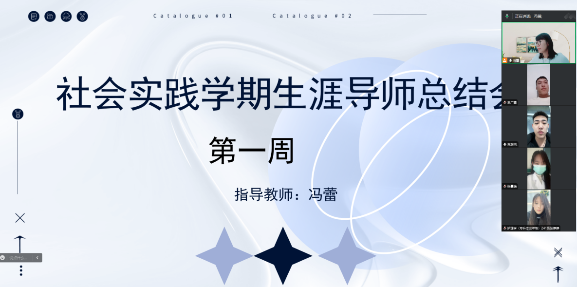 会议开始,冯蕾老师先简述了社会实践学期需要完成的内容,鼓励大家积极参与志愿服务,认真临摹字帖,以及母校回访的相关要求,对学生第一周任务完成情况进行评价,大部分学生完成较好,给予表扬。接下来,每组同学们根据各项目完成情况进行总结,同时潘娜老师根据汇报对每组同学提出了相应问题,也了解了同学们已经完成的进度和对下一步规划。