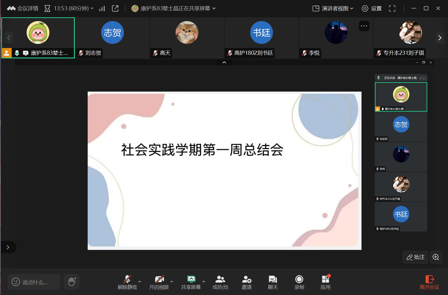 为确保社会实践学期进展顺利,于2025年1月14日下午5点,在线上展开了第一周总结会议,由高天同学主持,参加本次会议的为辇士晶老师及护理学(专升本三年制)241及231班生涯学生。