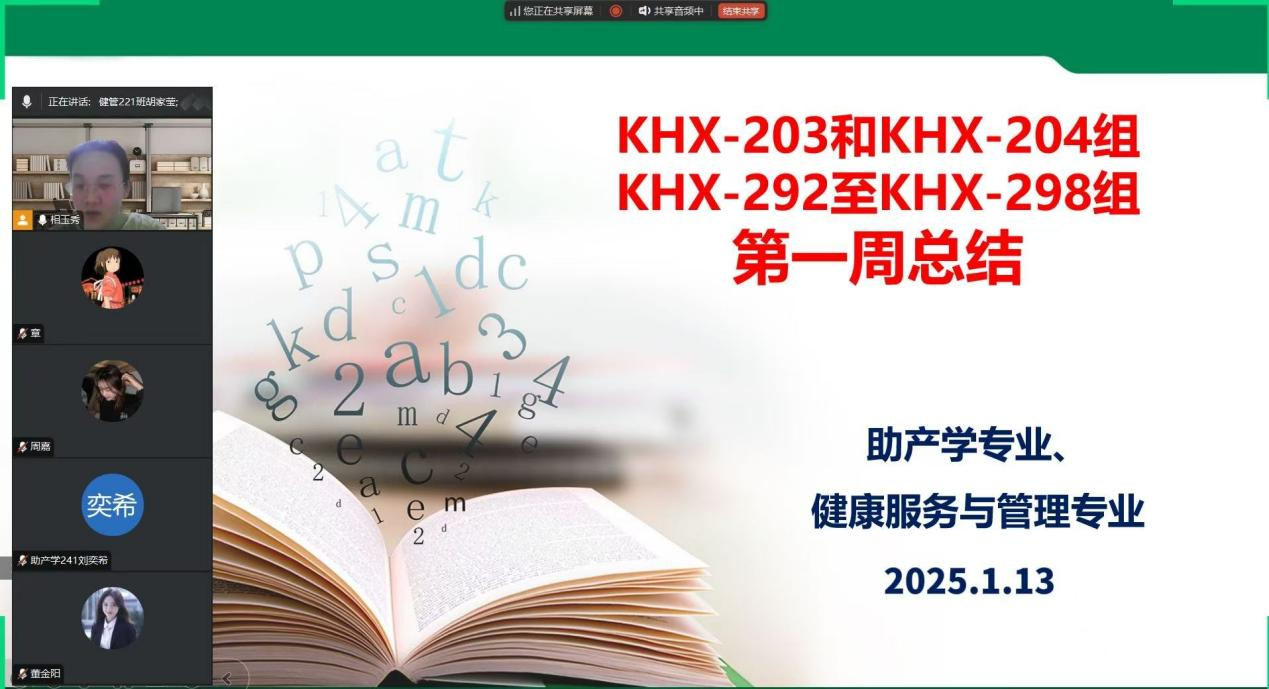 2025年1月13日下午,生涯指导教师相玉秀老师组织健管专业社会实践学期KHX-203至KHX-204组和助产学专业社会实践学期KHX-292至KHX-298组共9组36名学生进行2024-2025学年社会实践学期第一周线上总结会议。