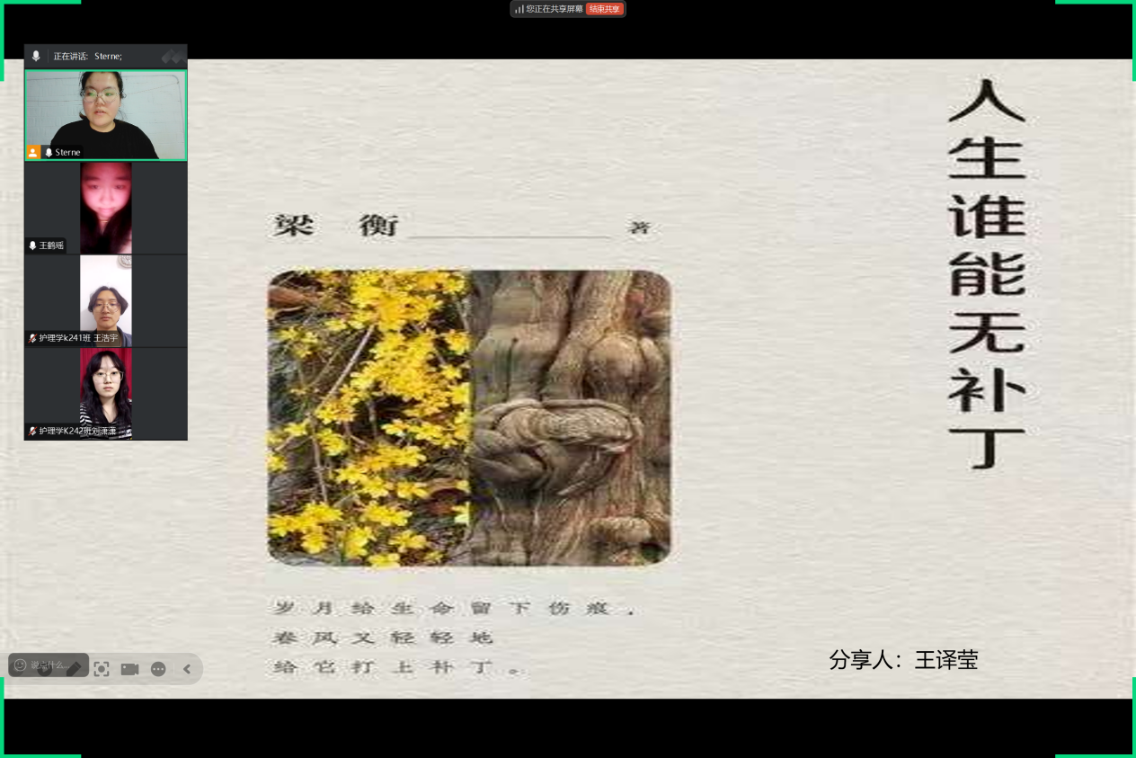 第四位同学王浩宇表示《人生谁能无补丁》促使我对人生意义进行深刻思考。书中展现的人生百态,让我意识到,人生的意义并非在于追求完美,而是在不完美中寻找价值。每个人的人生都会有“补丁”,关键在于如何面对。那些在挫折中依然坚守自我、为他人奉献的人,让我懂得生命的价值在于付出与成长。我开始思考自己能为社会、为家人做些什么。人生的“补丁”或许是遗憾,或许是伤痛,但它们也是我们成长的见证。我们要在修补“补丁”的过程中,找到属于自己的人生意义,让生命绽放独特光彩。